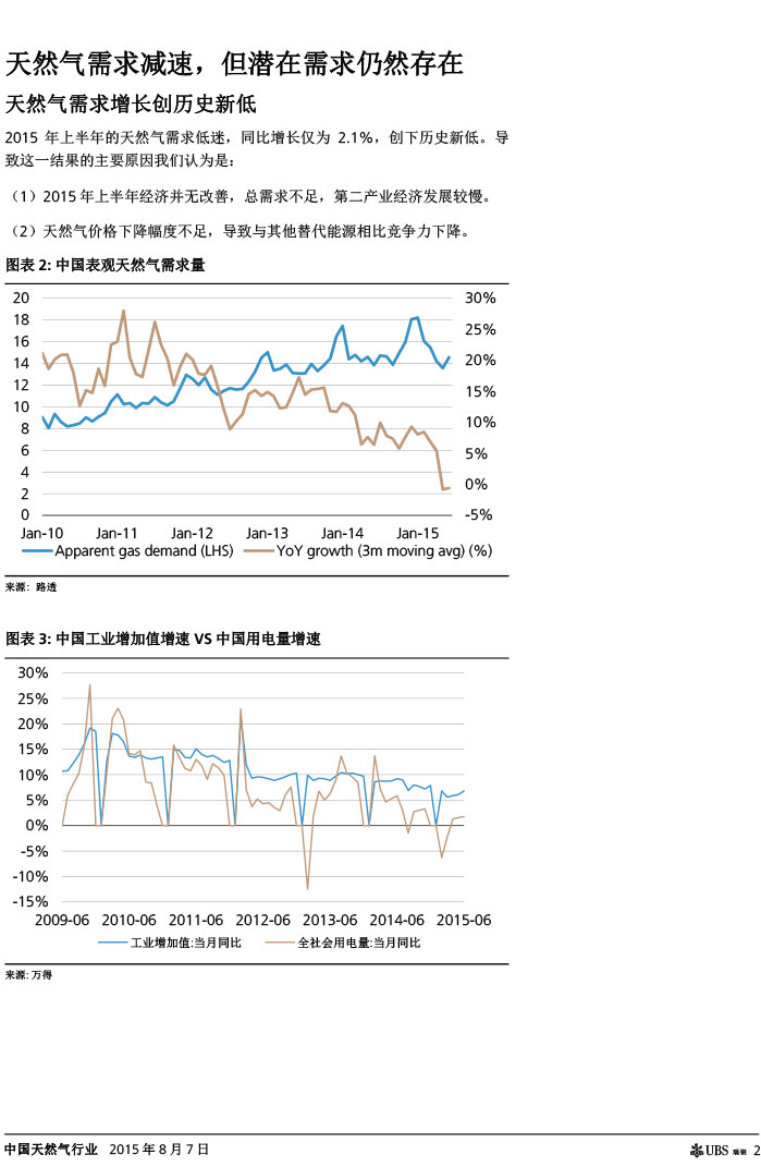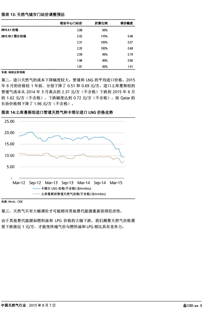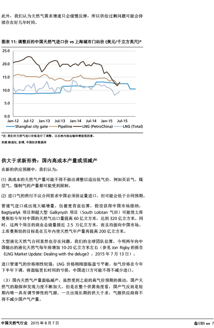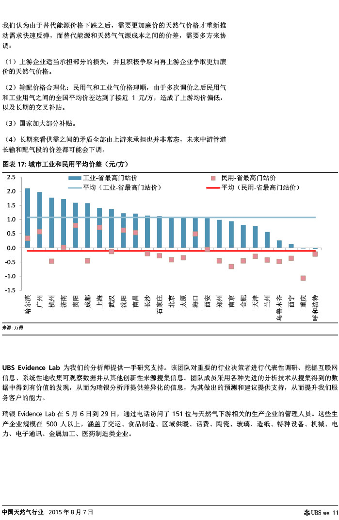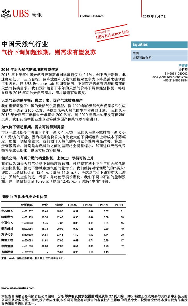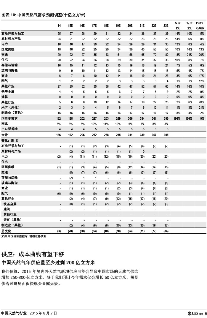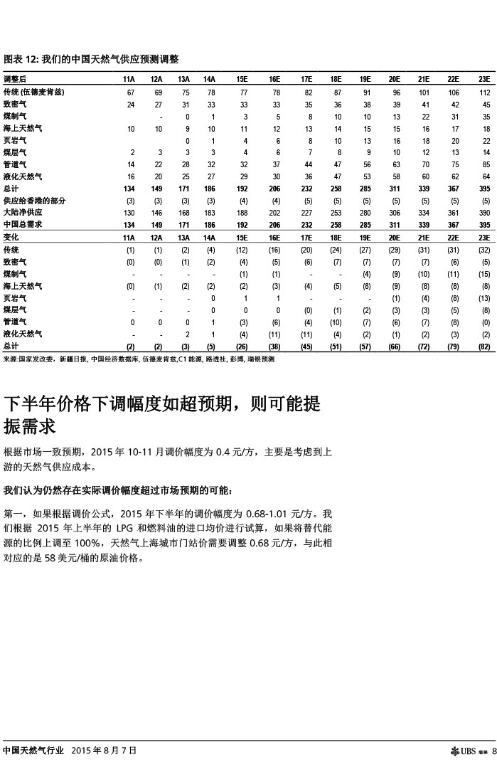 瑞银证券 中国天然气行业:气价下调如超预期,则需求有望复苏
